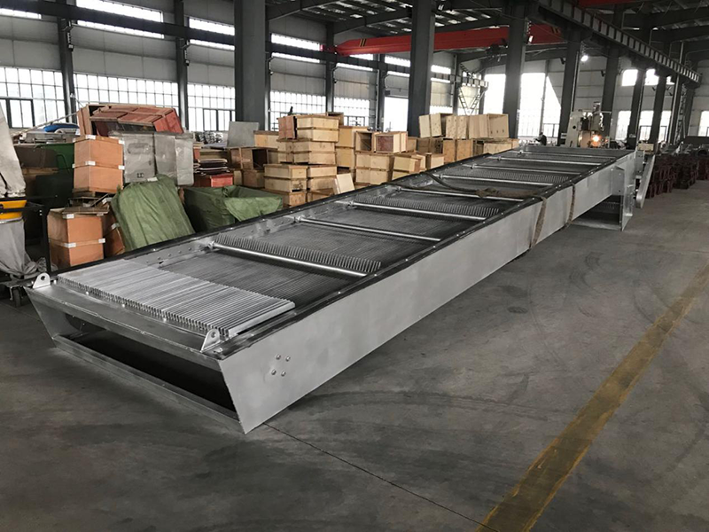 反撈式反撈式格柵由機(jī)架、驅(qū)動(dòng)裝置、傳動(dòng)導(dǎo)輪、耙鏈組合及耙齒、擋渣柵條。擋渣板等組成。在電機(jī)驅(qū)動(dòng)下,牽引鏈條在迎水面由下往上作回轉(zhuǎn)運(yùn)動(dòng)。當(dāng)牽引鏈上的耙齒軸運(yùn)轉(zhuǎn)到柵條的迎水面時(shí)。耙齒即插入柵條縫隙中由下往上作清撈動(dòng)作,將柵條上所截留的雜物刮落耙中,清除效率高且。當(dāng)齒耙運(yùn)轉(zhuǎn)到機(jī)器上,雜物靠自重自行脫落至容器或輸送機(jī)上,把雜物送走。